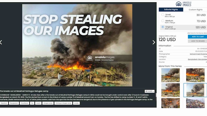 Arfat's photographs have appeared on numerous highly recognised platforms such as The Guardian, Time, CNN, Al Jazeera, and Amnesty International, all of which provided attribution to Anadolu/Getty Images and/or wrongfully credited Shahjahan as the photographer, the individual who stole the images. In addition, a google search reveals that potentially over a hundred other websites have published these stolen photographs. Anadolu Agency has acknowledged the photos belong to Arfat and removed the images from its sales pages and the Getty Images site, but they have not notified the numerous outlets that have used the images that they are in violation of copyright. In addition, as of 21 March, Anadolu Agency itself remains in breach of copyright on its Twitter and web site for using Arfat’s photograph without permission.