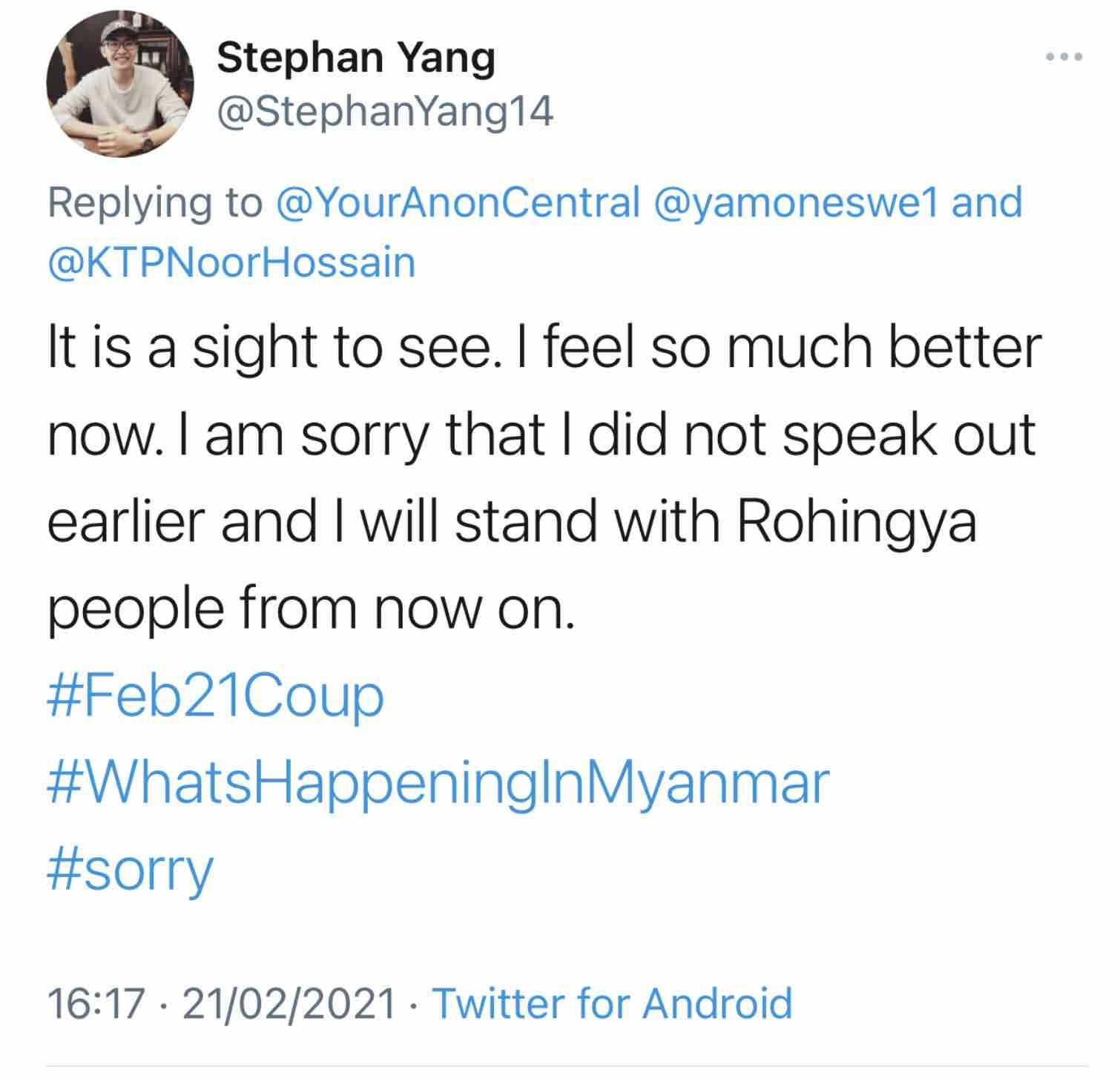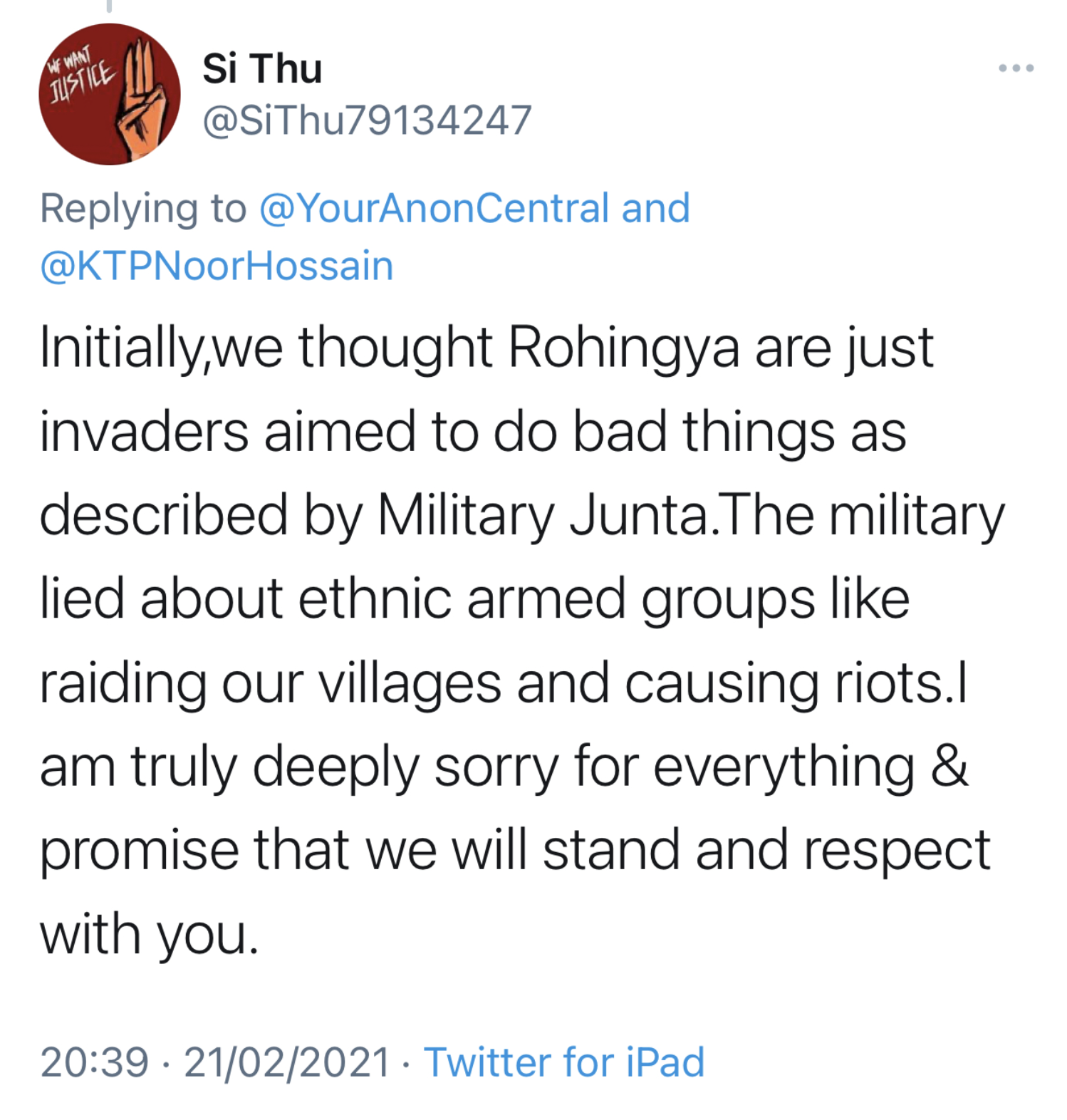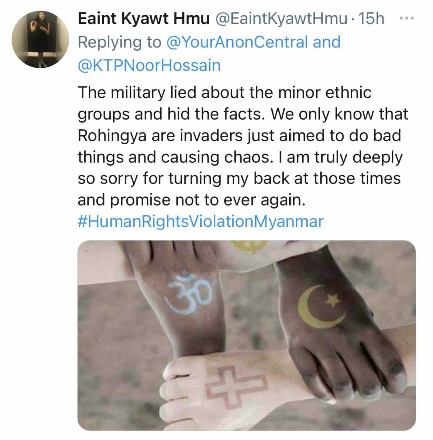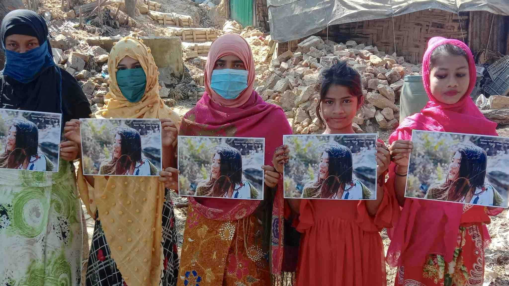 Soon afterwards, on 21 February, Noor Hossain photographed Rohingya women and girls holding an image of the slain anti-military protestor, Mya Thwet Thwet Khaing. This was retweeted thousands of times and received a huge positive response from those fighting for democracy in Myanmar. Three examples are given below.